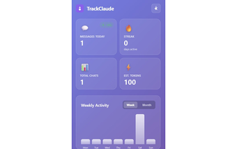 TrackClaude เป็นส่วนขยาย Chrome ฟรีที่ออกแบบมาสำหรับผู้ใช้ Claude AI โดยให้การติดตามการใช้งานแบบเรียลไทม์และการวิเคราะห์ รูปแบบสำคัญรวมถึงการนับข้อความพร้อมยอดรวมรายวัน การติดตามเซสชันการสนทนา และการใช้งานโทเค็นที่ประมาณการ ช่วยให้ผู้ใช้ได้รับข้อมูลเชิงลึกเกี่ยวกับการมีปฏิสัมพันธ์ของพวกเขา ส่วนขยายนี้มีอินเทอร์เฟซที่ดึงดูดสายตาพร้อมกับองค์ประกอบการออกแบบที่ทันสมัย รวมถึงแผนภูมิแบบโต้ตอบที่แสดงการใช้งานของโมเดลและแนวโน้มกิจกรรมรายสัปดาห์